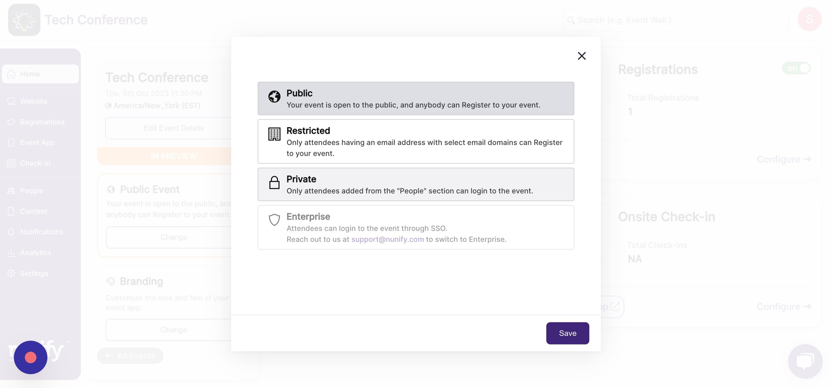 1. A “private event” means that registrations are not enabled on Nunify for this event. Access to the event app is restricted to the set of people uploaded by you in the people section of the event.