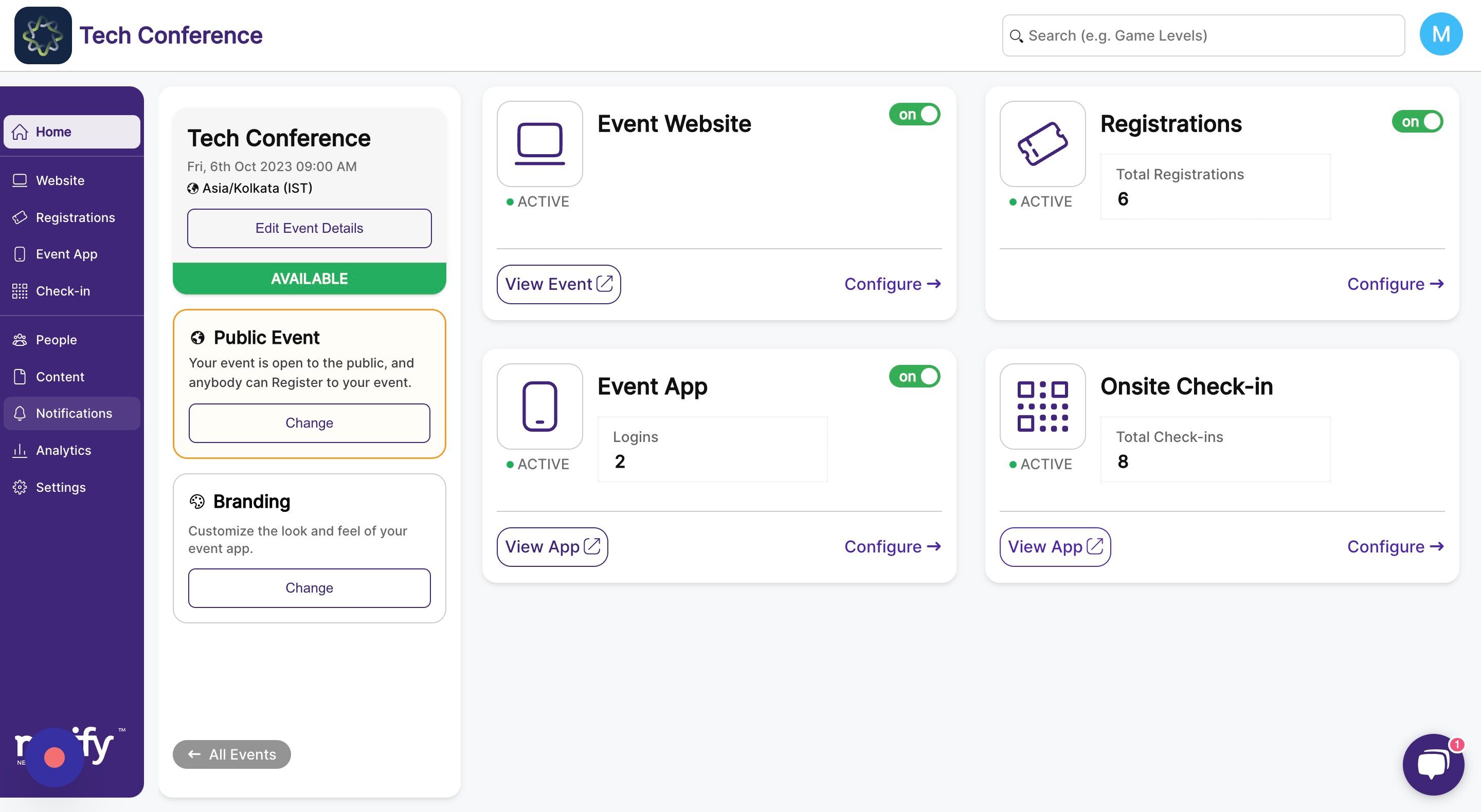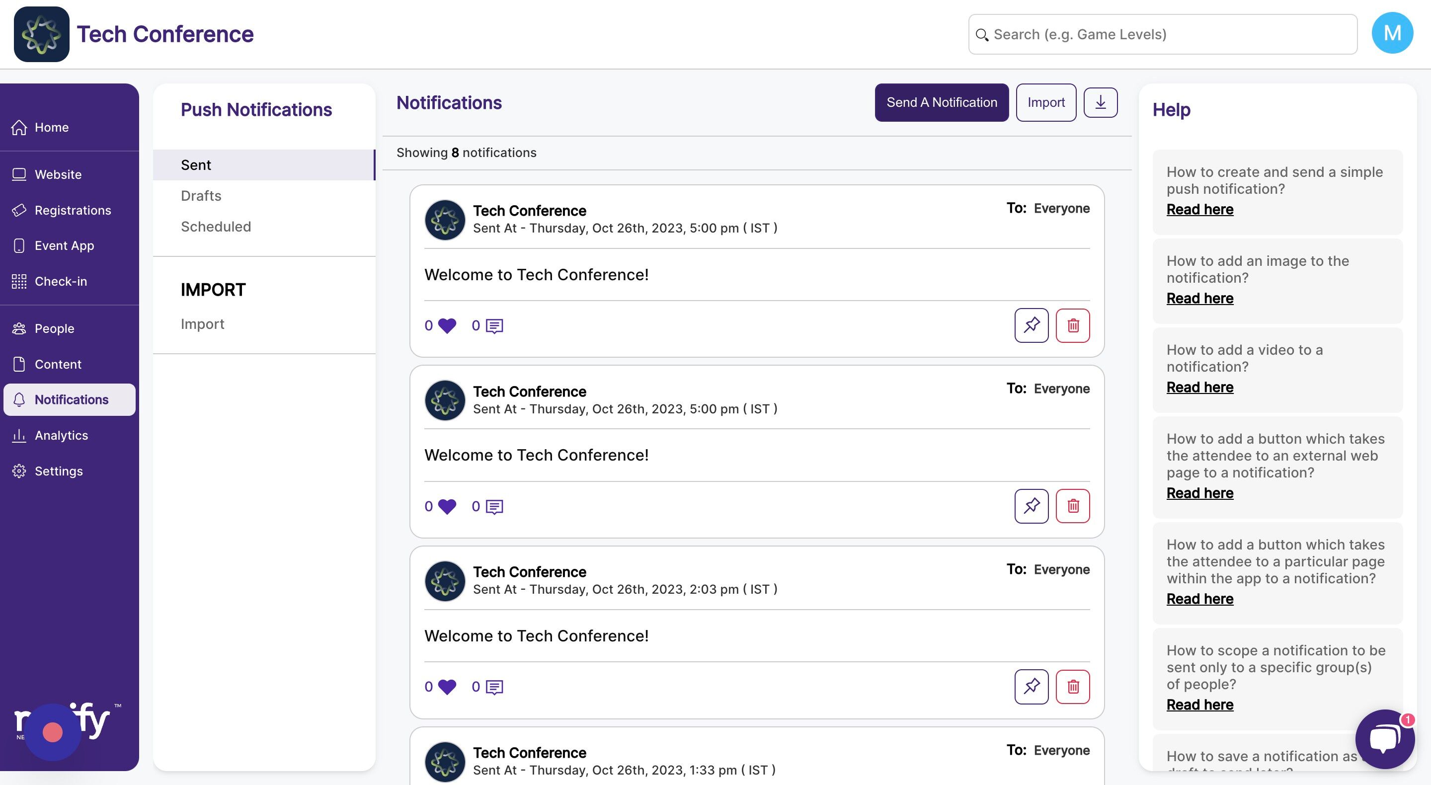 1. In the event dashboard, click on the Notifications from the side bar. This brings up the list of all sent push notifications.