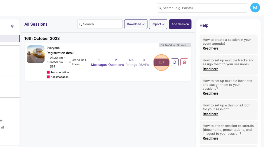 3. This will list all the sessions on your event agenda. Select the session you want to set up limited seats for and click on "Edit" on the session card.