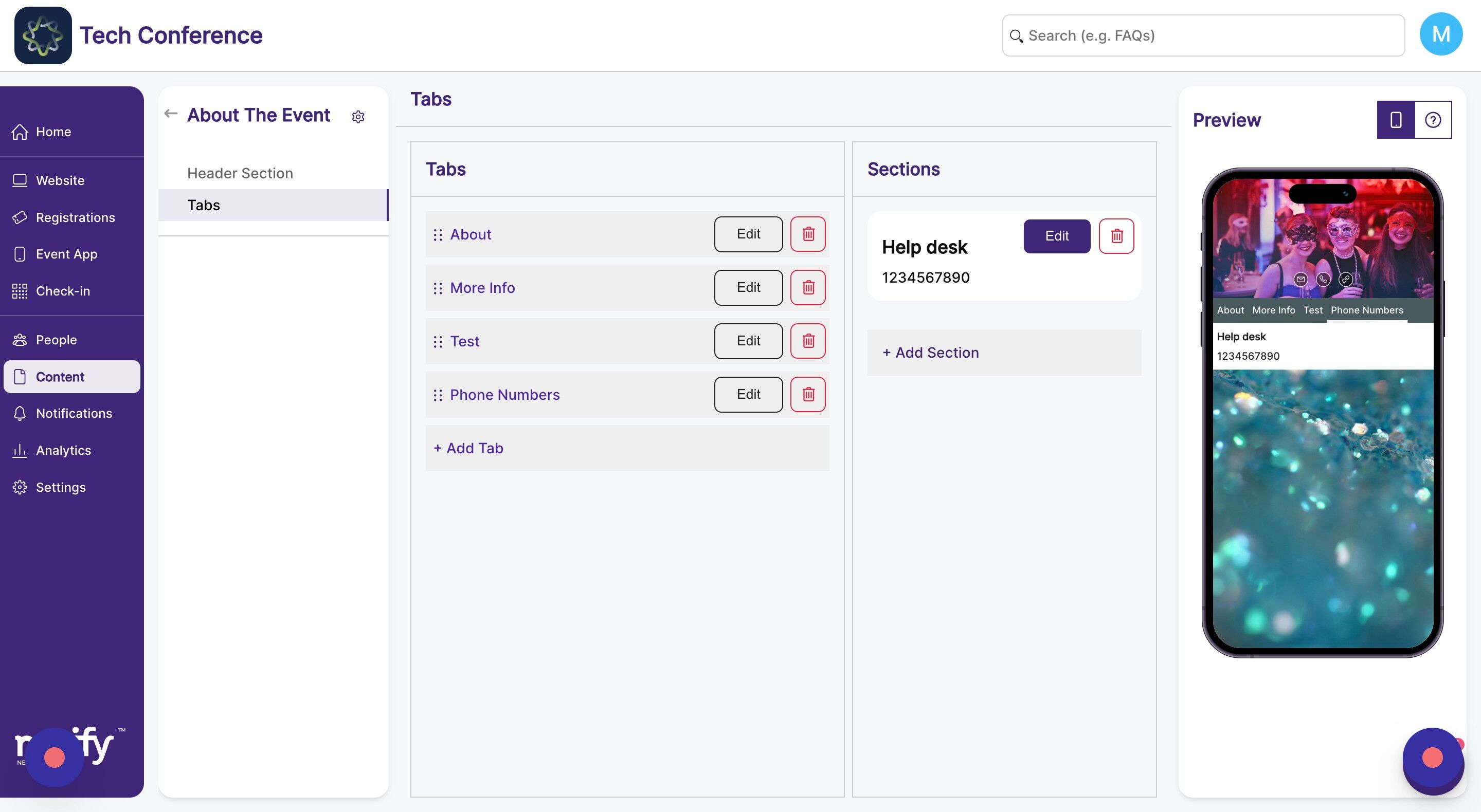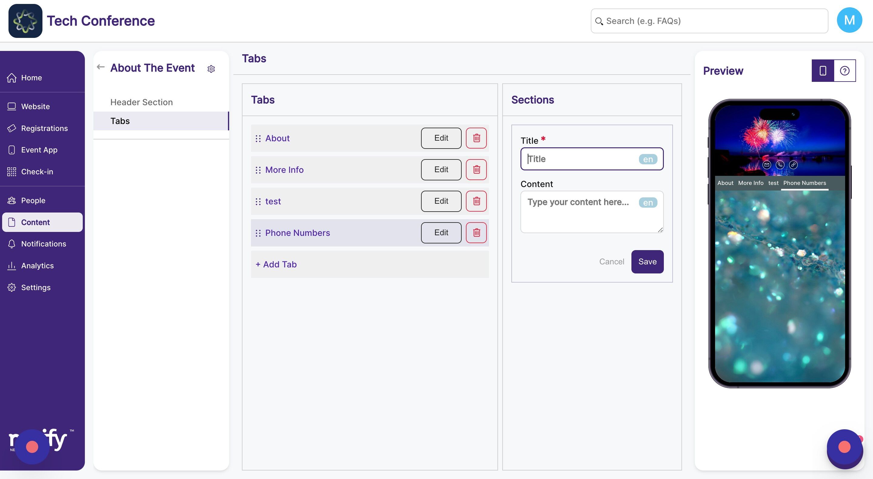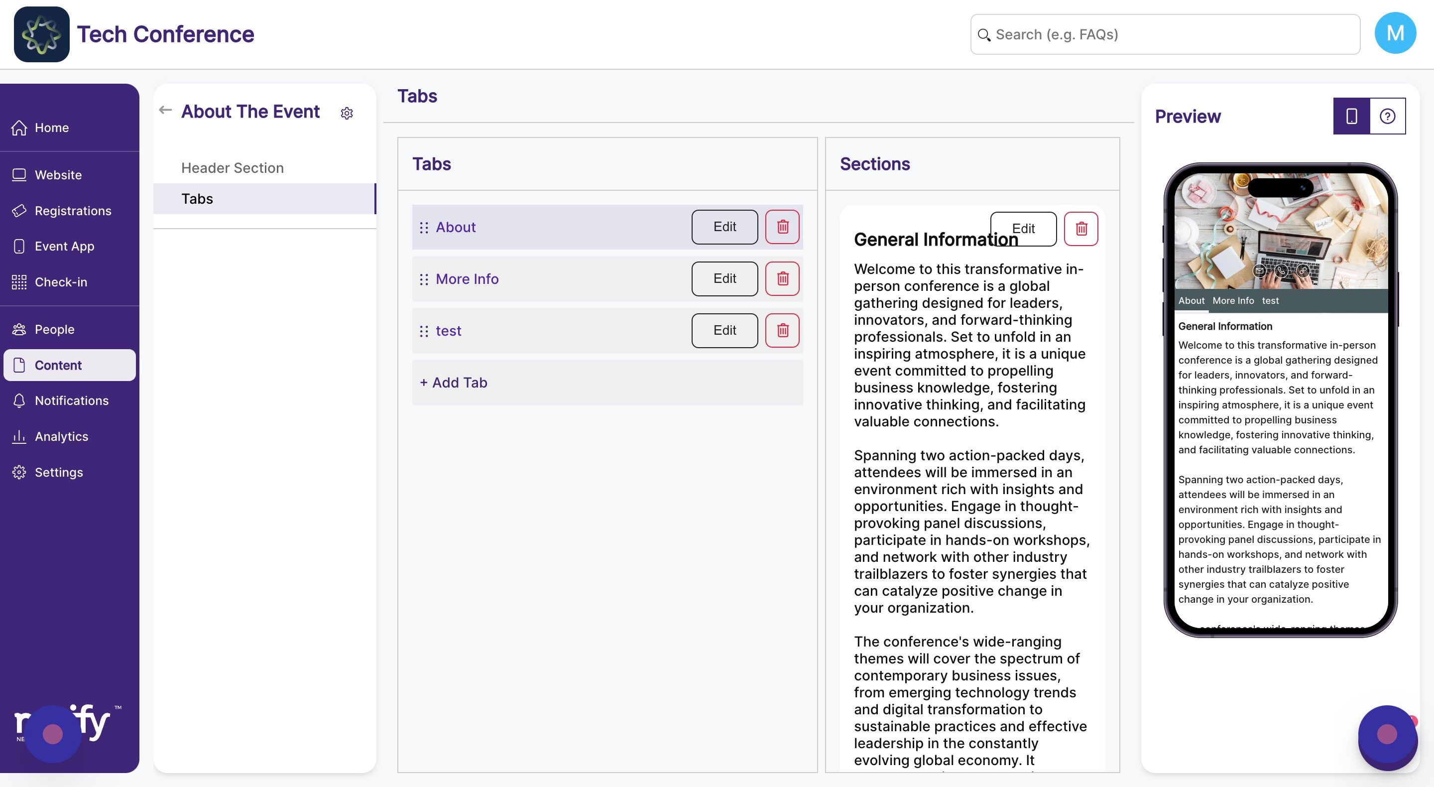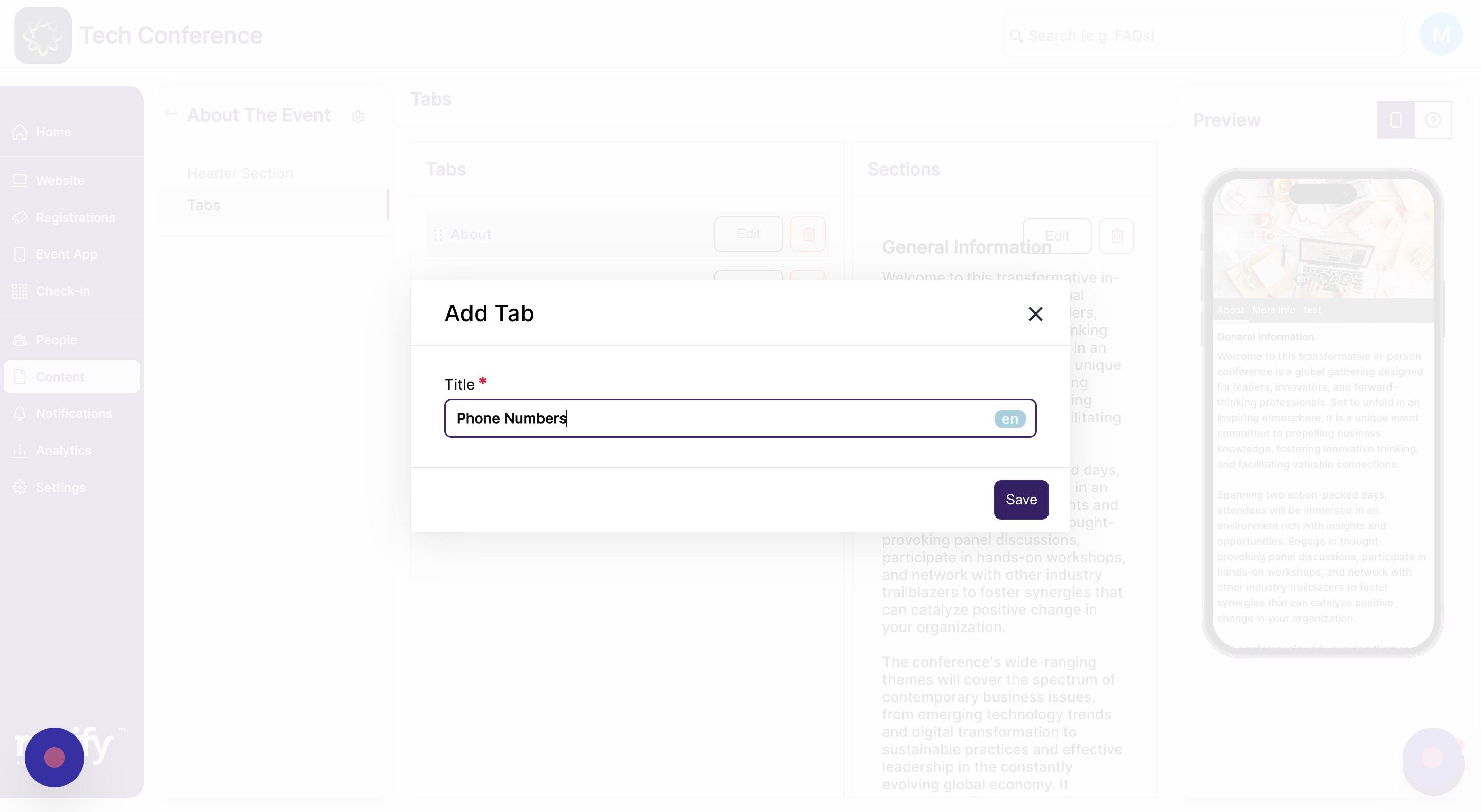 6. In Tabs, you can add multiple Tabs to showcase any information about your event.