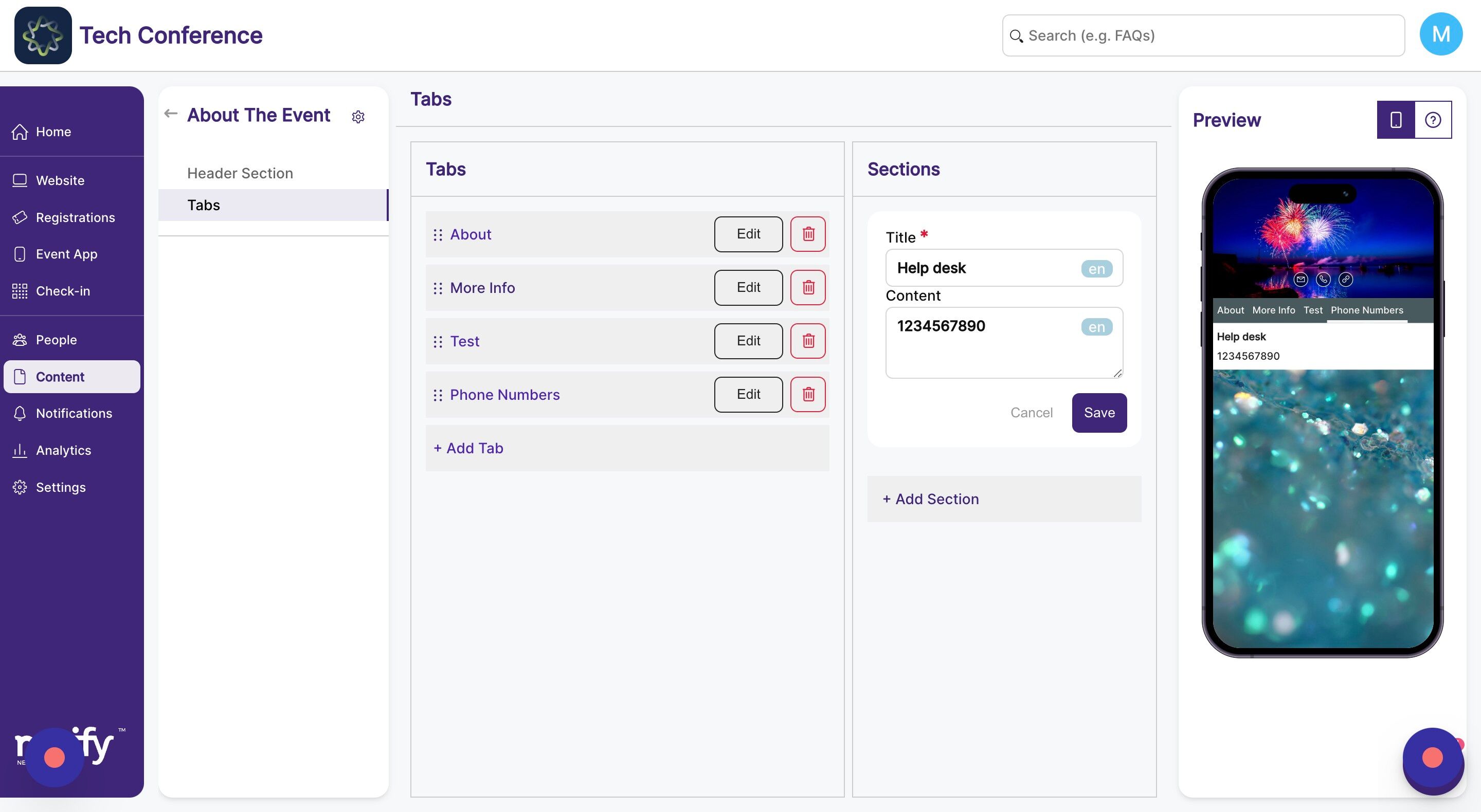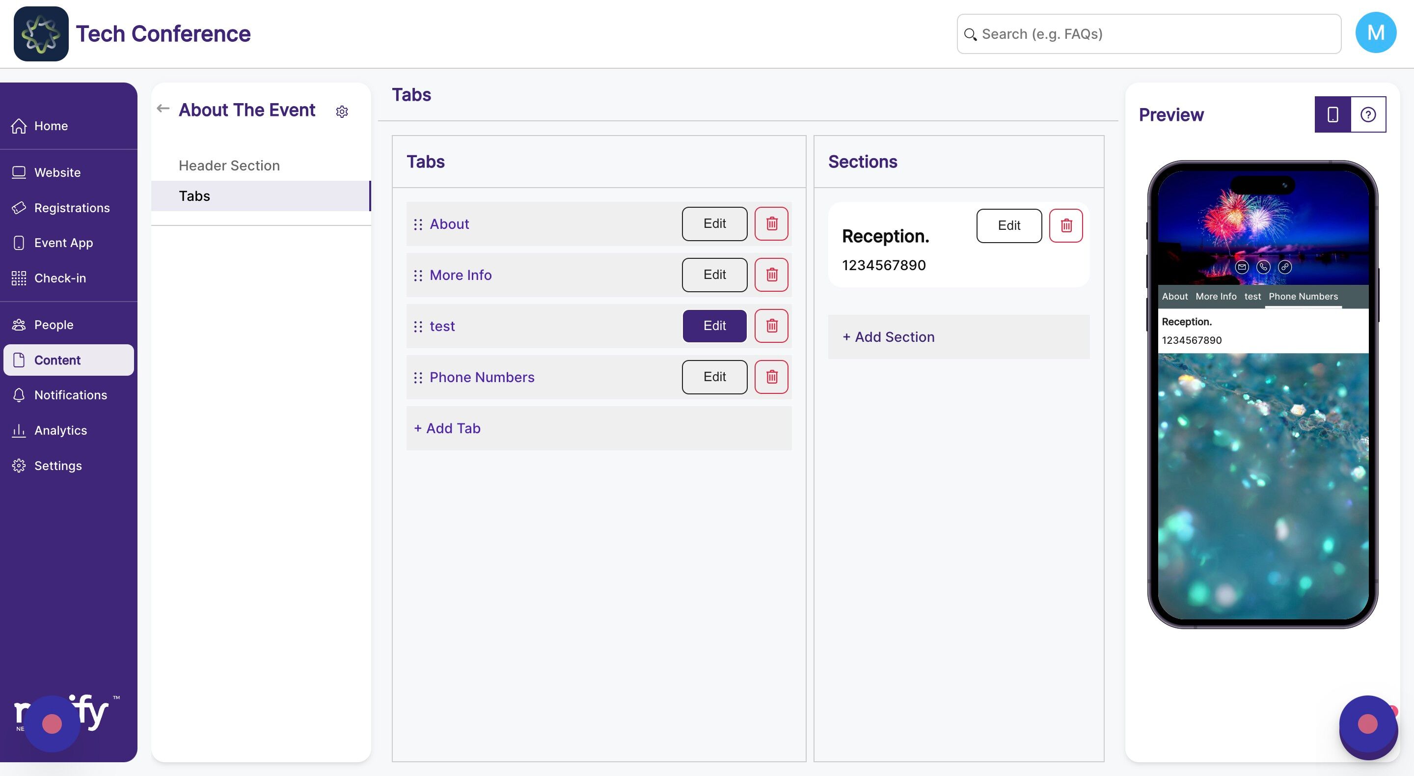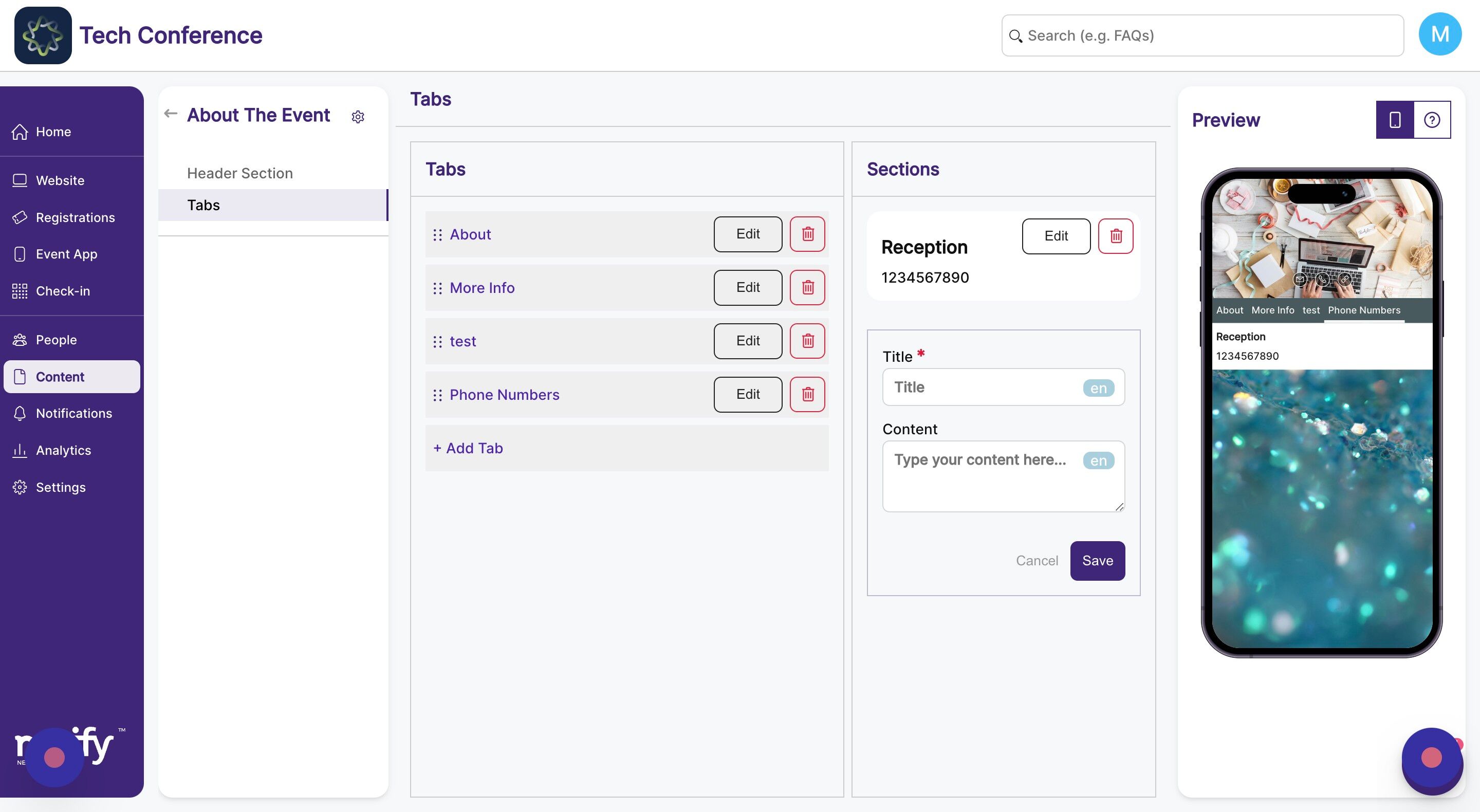 6. In Tabs, you can add multiple Tabs to showcase any information about your event.