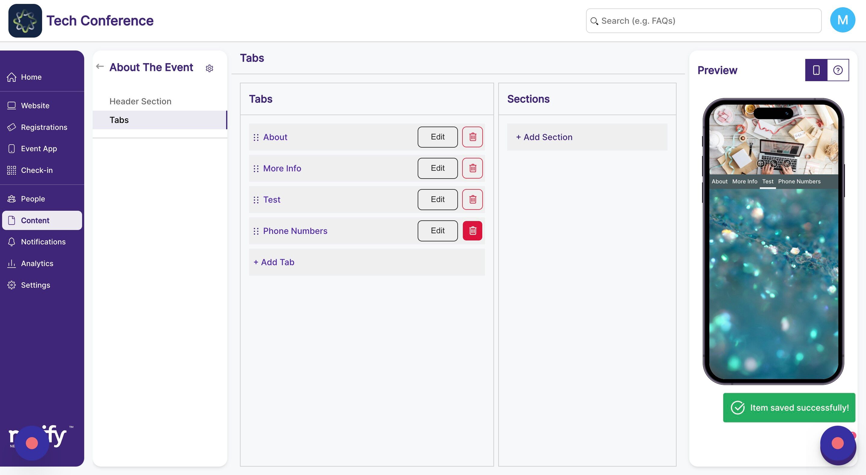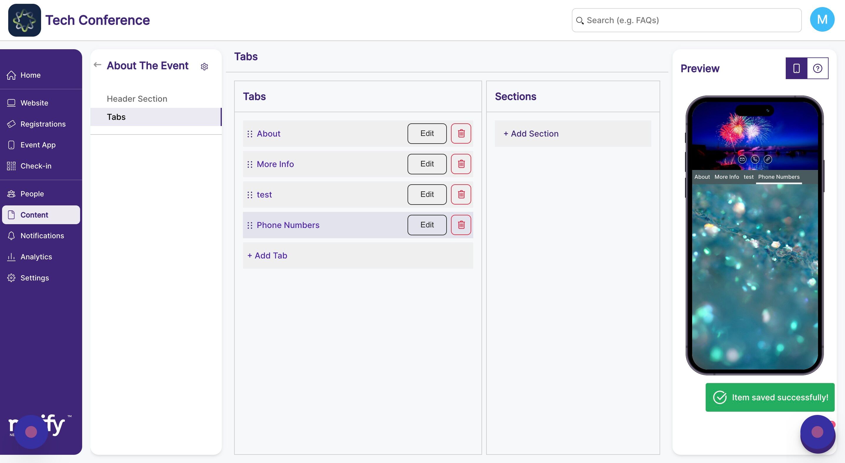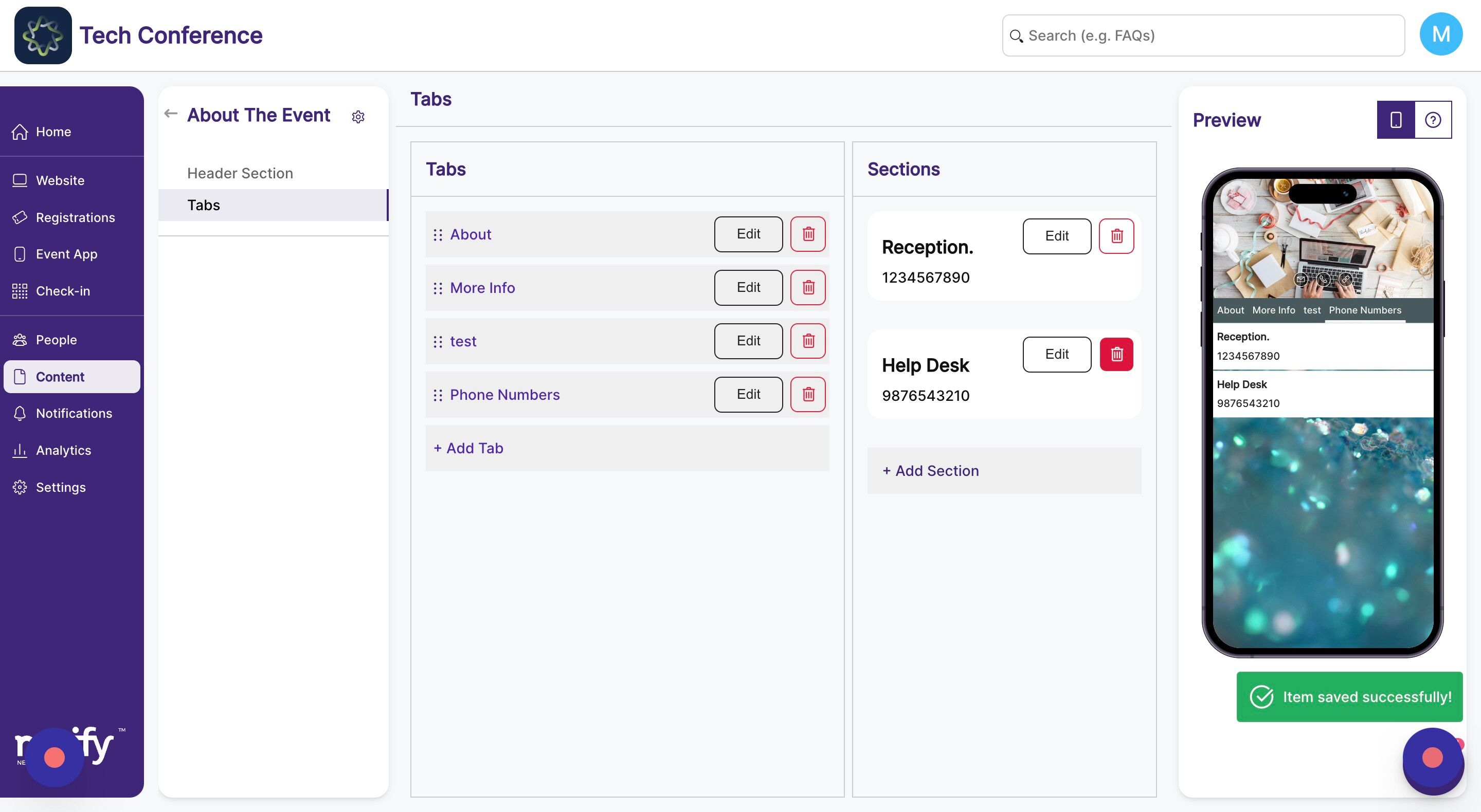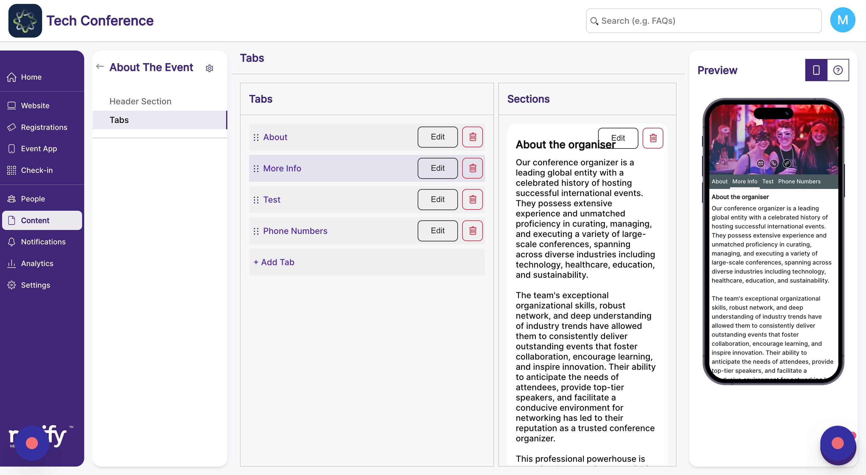 6. In Tabs, you can add multiple Tabs to showcase any information about your event.