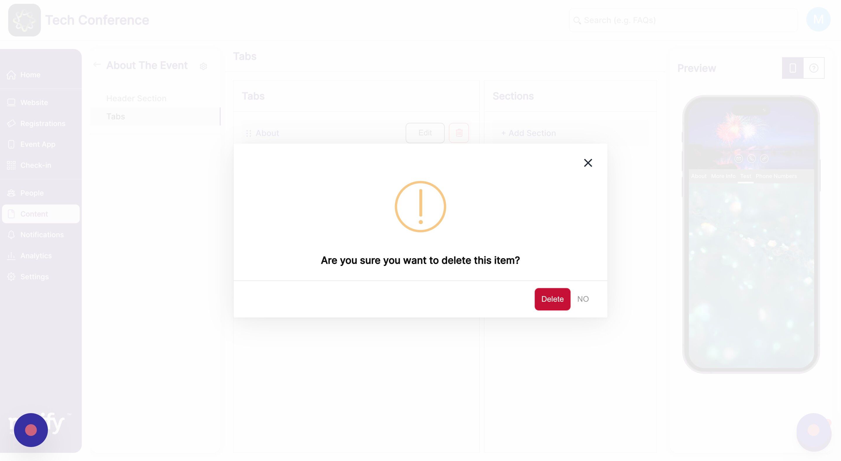 19. On confirmation, click “Delete” to delete the Tab. All the Sections associated with the Tab will also be deleted.