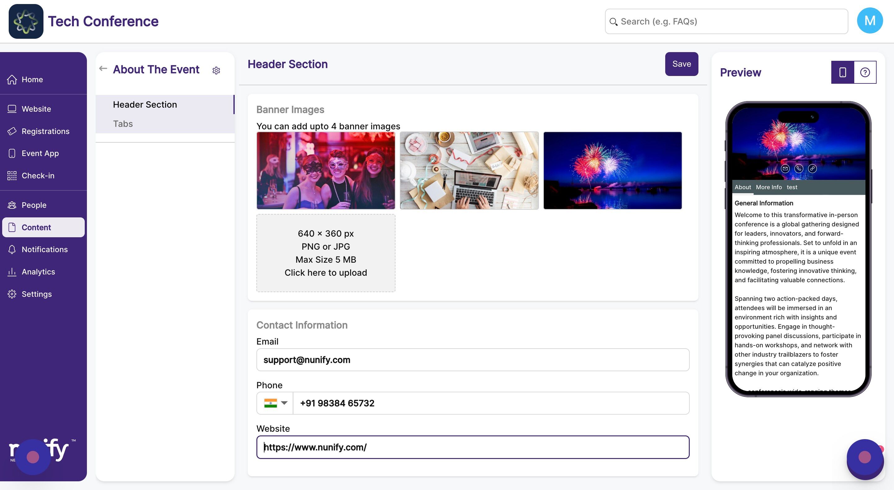 5. You can also enter contact information, including email, phone, and website. All this information will be visible on the header of the info page in your event app.