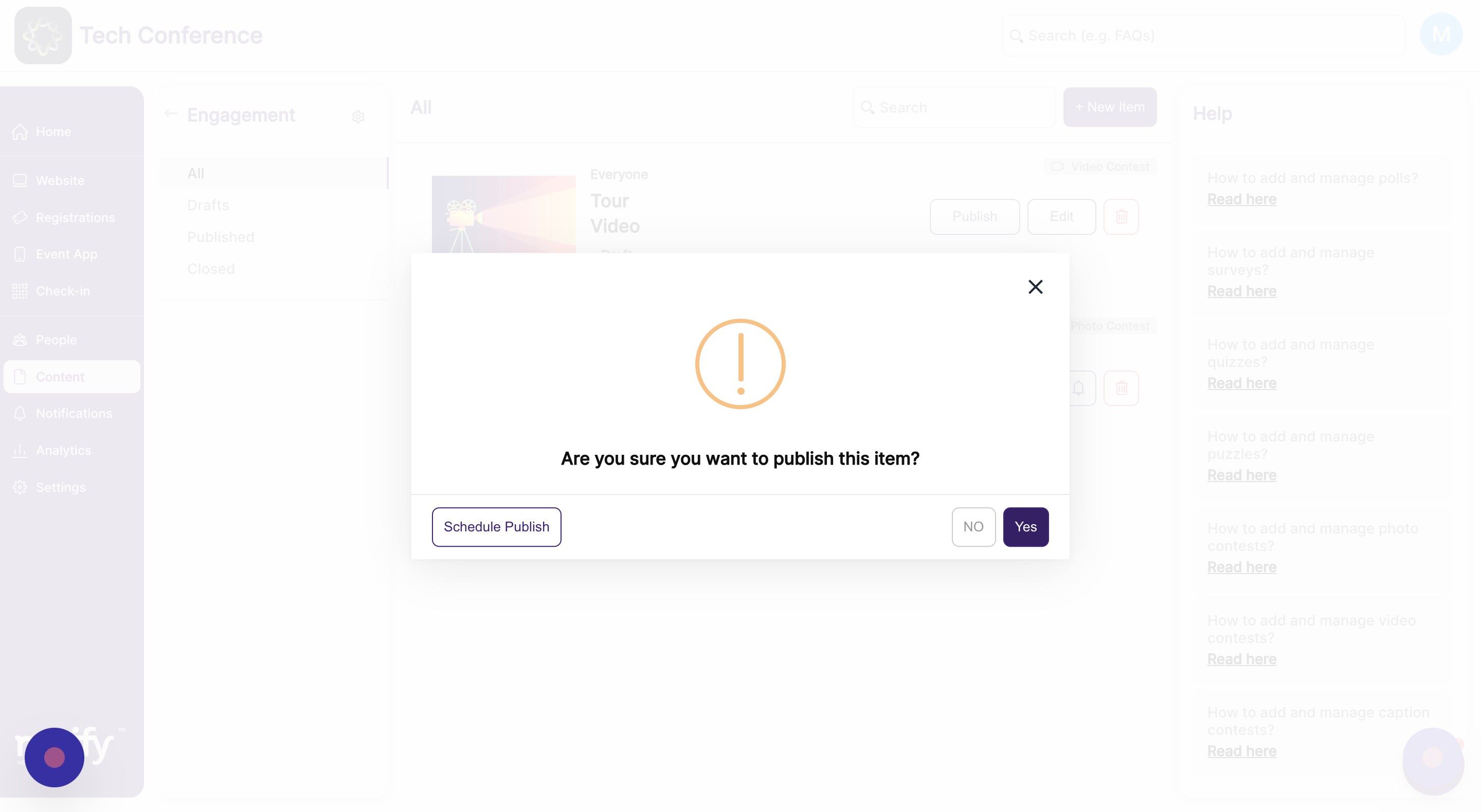 4. On the confirmation pop-up, click “yes” to publish the video contest.